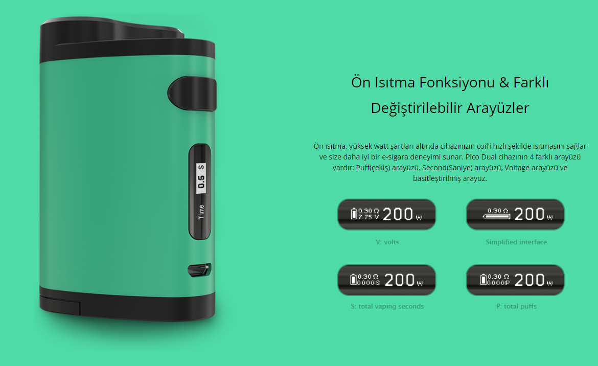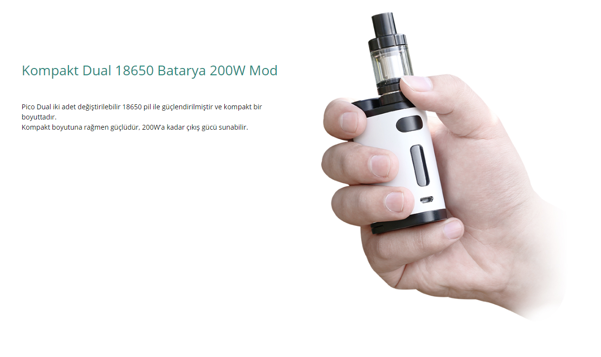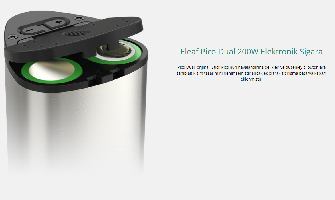 Eleaf Pico Dual 200W elektronik sigarası ,200w güç çıkışı ile 18650 çift pil girişli modu sayesinde oldukça yüksek performans sağlamaktadır.Melo 3 mini Atomizeri sayesinde aroma ve buhar performansınızı yüksek ve verimli alabileceğiniz bir yapıya sahiptir.
