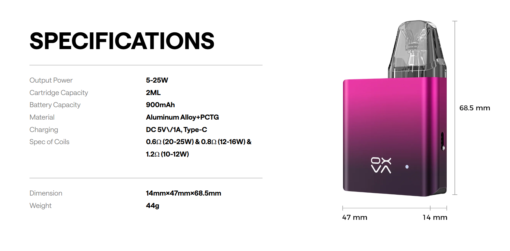 Xlim SQ, tüm gün boyunca güvenilir kullanım için 900mAh dahili batarya ile çalışır ve Xlim SQ, 25W maksimum güce ulaşarak son derece lezzetli ve tatmin edici bir MTL (ağızdan akciğere) vape sağlar. Type-C USB şarjı sayesinde cihaz çok hızlı bir şekilde şarj edilebilir. Oxva Xlim SQ, düğmeler yerine Otomatik Nefes Alma moduyla çalıştırılır, böylece tıpkı geleneksel bir sigara gibi Xlim SQ'nuzdan yalnızca bir nefes çekmeniz gerekir; bu da Xlim SQ'yu yeni elektronik sigaralar ve eski eski kullanıcılar için ideal bir e-sigara haline getirir -sigara içenler.