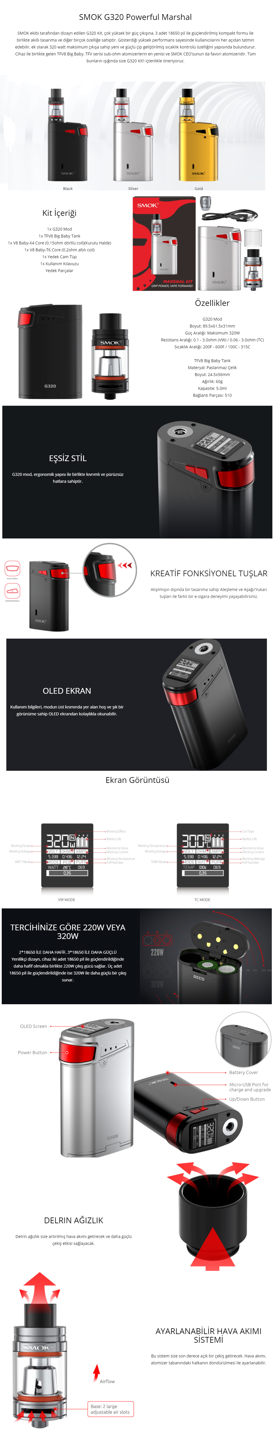 Smok Marshal Kit - SMOK G320 elektronik sigarası 18650 3 adet pil ile çalışmaktadır,bu nedenle çok yüksek güç çıkışı sağlar,güç çıkışıyla orantılı olarak en yüksek buharı ve en güzel likit tadlarını sizlerle buluşturur.