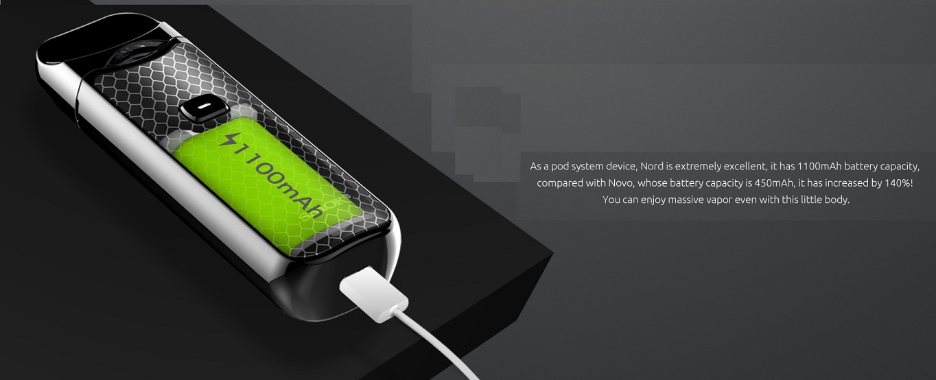 Smok Nord Pod, 1100 mAh batarya kapasitesiyle uzun süreli kullanım imkanı sunar. Cihazın pil ömrü, kullanıcının vaping alışkanlıklarına bağlı olarak değişkenlik gösterebilir.