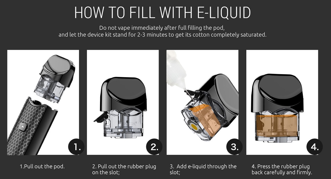Pod'un yan tarafında bulunan kauçuk kapakçığı açarak, likit dolum deliğine erişin. Dikkatlice likit ekleyin ve kapakçığı tekrar kapatın. İlk kullanımdan önce, likitli pod'un birkaç dakika beklemesine izin verin.