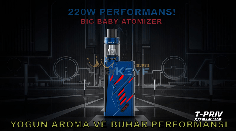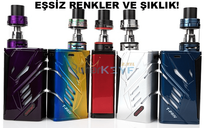 SMOK T-PRIV Kit 220w,bir adet T-Priv Modundan ve bir TFV8 Big baby atomizerinden oluşur. Mod,kurulumunuzun bir uzay gemisi gibi parlamasını sağlamak için dokuz farklı renk ayarlı LED ışığa sahiptir. Çift yüksek amp 18650 pil ile güçlendirilmiş,220 watt'a kadar ateş edebiliyor ve sıcaklık kontrol modunda Nikel,Titanyum ve SS 316 tellerini destekliyor. Ayrıntılı işletim arayüzü,üst OLED ekranından okunabilir. 5.0 ml'lik depoya gelince,hem lezzet hem de bulut kovalayanlar için tasarlanmış Baby Beast V8 Core bobin kafalarını kullanmaktadır. Bu bobin başlıkları,hem düşük hem de yüksek wattlı inşaatlar için tasarlanmıştır ve maksimum lezzet ve buhar üretimi için patentli çift,octuple,sextuple ve dörtlü bobinlere sahiptir. Depo ayrıca daha yüksek hava akımı verimi için geniş bir ısıtma hava borusuna sahiptir. Büyük çift ayarlanabilir hava akımı yuvaları kendi kişisel tercihlerinize göre ayarlanabilir. Her neyse,T-PRIV çekmeye değer!