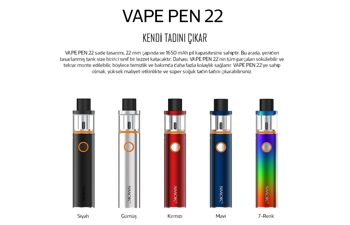 Smok elektronik sigara vape pen 22 modeli en çok satan cihazlardandır,elektronik sigara almak isteyen ve sigarayı yeni bırakmaya çalışanlar için uygun bir üründür.Smok vape pen 22 elektronik sigara cihazı türkiyede yeni piyasaya girmiş nadir ve en kaliteli elektronik sigara cihazıdır.Şimdi hemen sitemizden detaylı bilgiye ulaşabilir ve Smok elektronik sigara vape pen 22 satın alabilirsiniz.