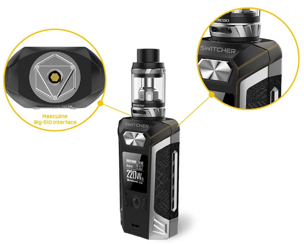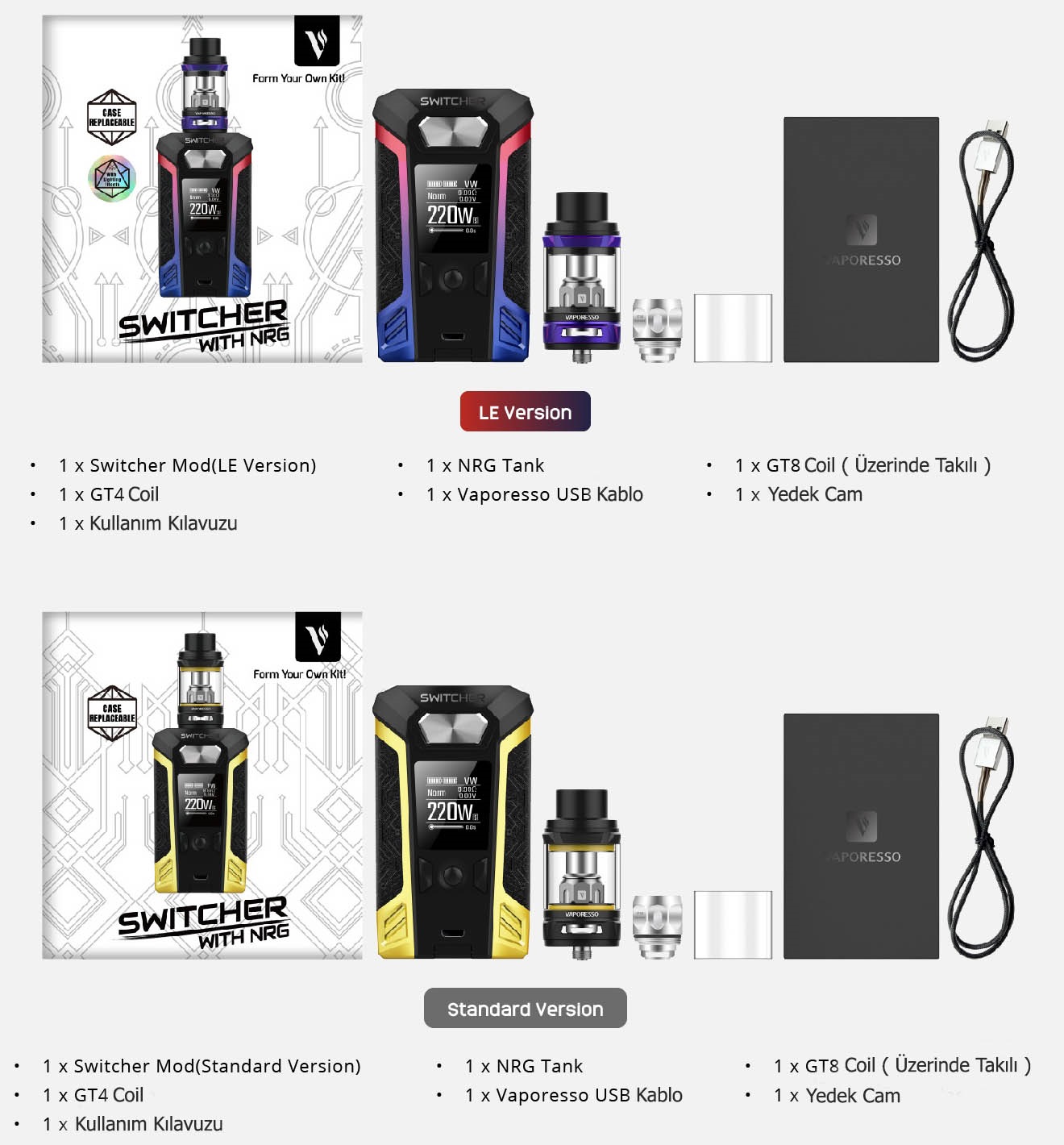 Vaporesso Switcher Kiti,220w yüksek performans gücüyle oldukça tatmin edici bir cihaz olarak vaporesso firmasının amiral gemisi sayılabilicek bir ürün.Grafiksel yeni tuşlarıyla oldukça dikkat çeken switcher,kilit açma düşmesi,puf sayacı ve güç korumasıyla oldukça özverili bir basit kullanım özelliklerine sahip en güncel OMNI Board 2.6 ile güçlendirilmiş bir elektronik sigaradır.