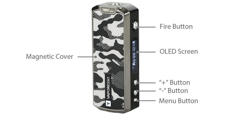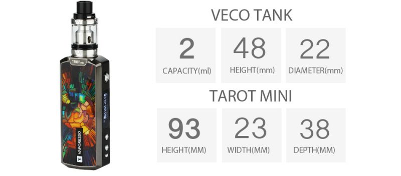 Tasarımsal ve görsel olarak muhteşem gözüken Vaporesso tarot mini,80w gücü ile çalışan 18650 1 adet pil ile çalışan başlangıç seti cihazıdır.Omni işlemci kartına sahip olan tarot mini,VW,VT,TCR,CCW,CCT ateşleme özelliklerini destekler.Mini boyutu ile oldukça küçük olan ve kullanımı gayet basit olan bu ürün,üst hava akışı sistemi sayesinde sıfır sızıntıyı garantiler.