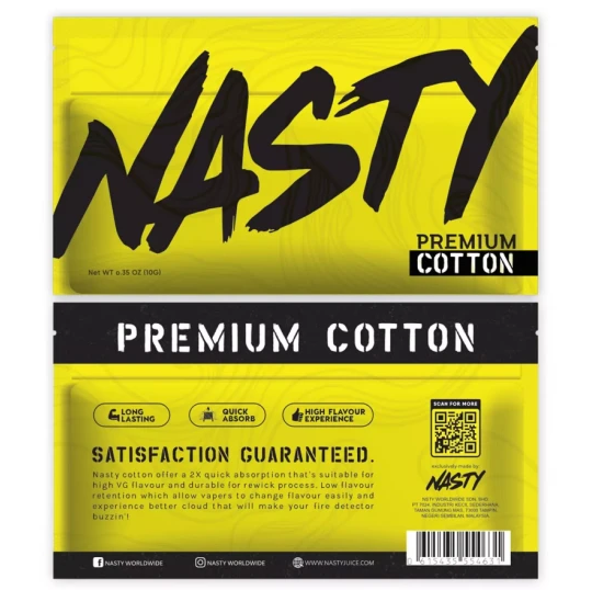 Nasty Premium Cotton Elektronik Sigara Pamuk, e-sigara kullanıcıları için özel olarak tasarlanmış yüksek kaliteli bir pamuk türüdür. Bu pamuk, daha temiz bir tat ve daha iyi bir buhar deneyimi sağlamak amacıyla üretilmiştir.