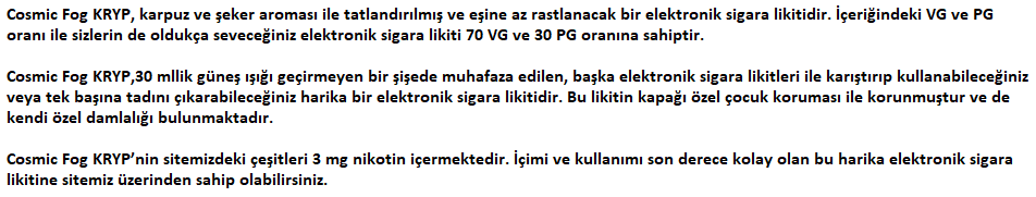 Cosmic Fog KRYP Özellikleri:Cosmic Fog KRYP Karpuz Ve Şeker Aromalı Bir Lİkittir. Cosmic Fog KRYP %70 VG Ve %30 PG Oranına Sahip Premium Bir Likittir. Cosmic Fog KRYP 3 mg Nikotin Oranına Sahip Bir Likittir. Cosmic Fog KRYP 30 ml’lik Özel Bir Şişede Saklanmaktadır. Cosmic Fog KRYP İçimi Kolay / Rahat Bir Likittir. Bu Likit,Başka Likitlerle Veya Tek Olarak Kullanılabilir. |